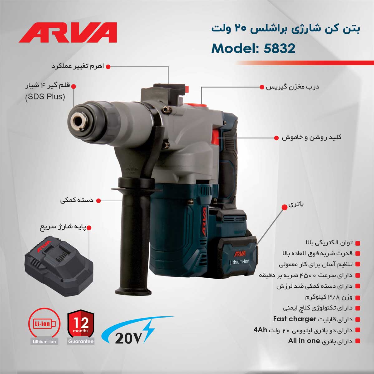 بتن کن شارژی آروا مدل 5832 نسل جدیدی از بتن کن شارژی می باشد که بدون ذغال کار می کند به همین دلیل به آن براشلس نیز می گویند. این محصول جز دسته محصولات all in one می باشد. در این دسته ابزار هایی مانند دریل، بتن کن، مینی فرز، اره گرد بر و آچار بکس وجود دارد.