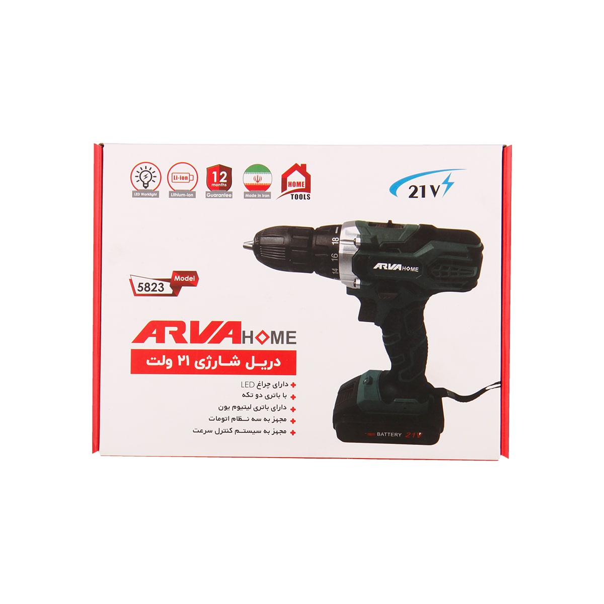 دریل های شارژی در قدرت ها و ولتاژ های متنوعی طراحی می شوند که با توجه به قدرتشان مورد استفاده قرار می گیرند. دریل شارژی خانگی آروا 5823 دارای ولتاژ 21 ولت و حداکثر گشتاور 23 نیوتن متر است. سه نظام این دریل شارژی خانگی اتومات بوده و سایز آن 10 میلی متر می باشد. این دستگاه مجهز به کلید های گوناگون است و با آن علاوه بر سوراخکاری، باز و بستن پیچ نیز می توانید انجام دهید. دریل پیچ گوشتی شارژی 5823 دارای چراغ LED برای کار در محیط های کم نور است و همچنین بند مچی نیز دارد.