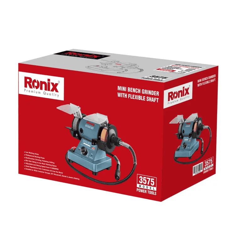 “چرخ سنباده یا سنگ فرز رومیزی، ابزاری است که دو طرف آن، دو صفحه سنباده یا پولیش تعبیه شده و از آن به صورت ثابت روی میز استفاده میشود. رونیکس، مدلهای متفاوتی از چرخ سنباده را متناسب با نیاز کاربران طراحی و تولید میکند. چرخ سنباده مینیاتوری 3575 رونیکس با شلنگ سه نظامدار، ابزاری چندمنظوره است و برای فرزکاری، سوراخکاری، پولیش، سنبادهزنی و حکاکی سطوح مختلف از آن استفاده میشود.nn سنگ فرز رومیزی 3575 رونیکس دارای ابعاد کوچک، جمعوجور، کمحجم با یک موتور قدرتمند 120 واتی است. تنظیم سرعت در محدودهی صفر تا 10000 دور بر دقیقه در این ابزار امکانپذیر است. این سنگ فرز، نیازهای مشاغل مختلف مانند صنایع چوب، جواهرسازی، دندانسازی و کارهای فنی خانگی را به خوبی تامین میکند.nnدر بخش توضیحات محصول، جزئیات بیشتری را در مورد چرخ سنباده 75 میلیمتری مینیاتوری 120 وات با شلنگ رونیکس با مدل 3575، بررسی میکنیم.”